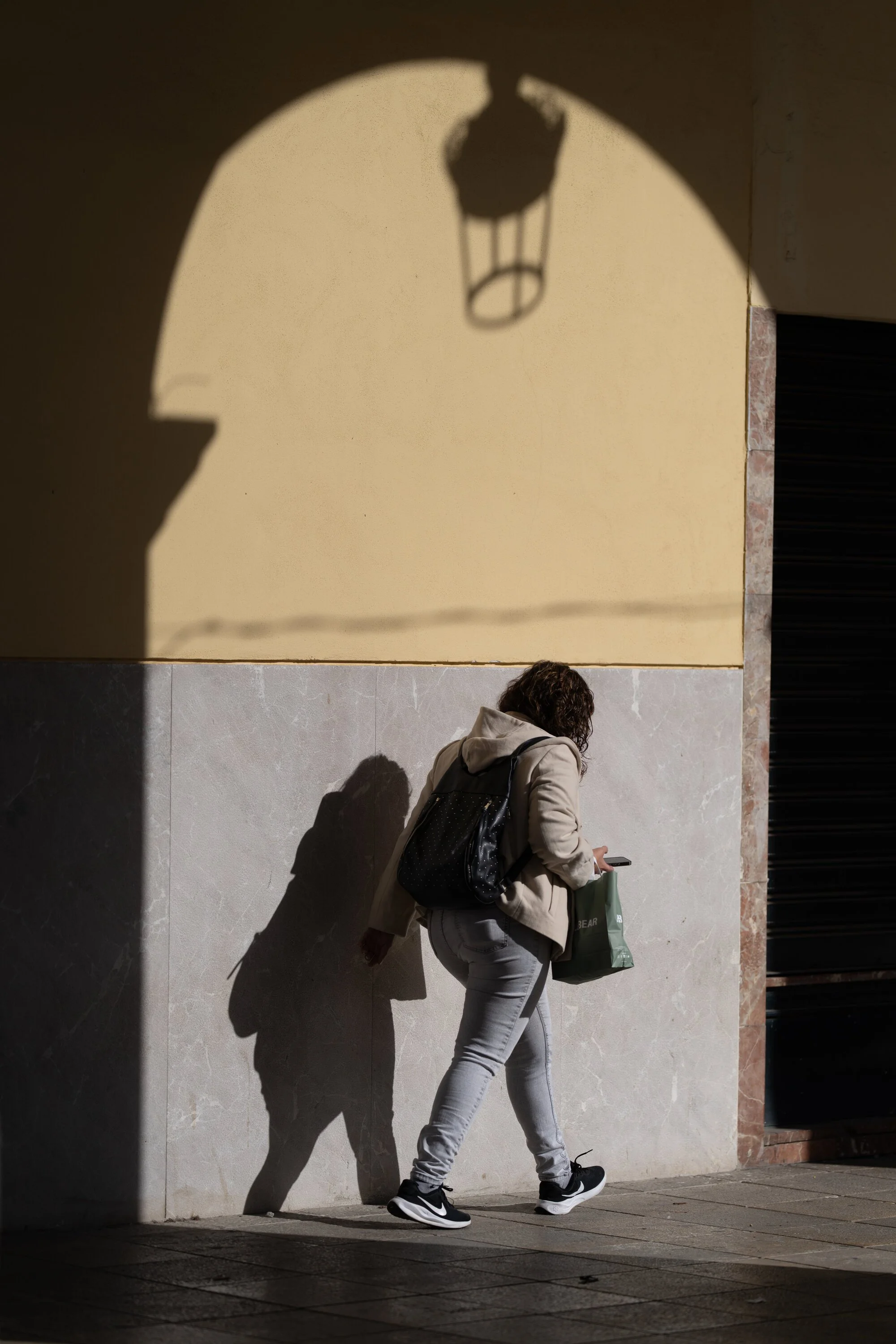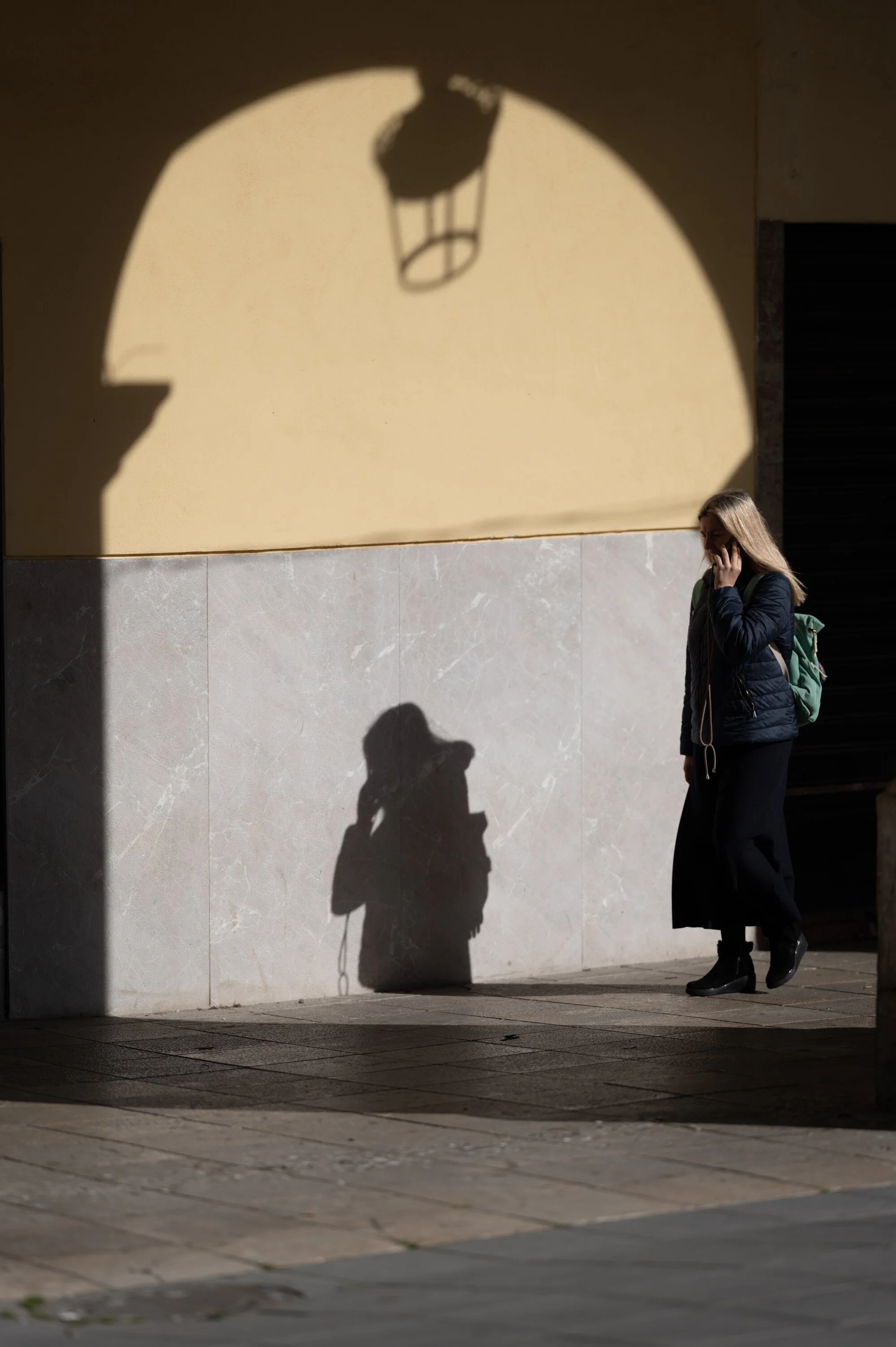 palma in winter light. harsh shadows, bright surfaces, people in motion. camera on shoulder, reacting to what comes. both with eye-af, both wide open.